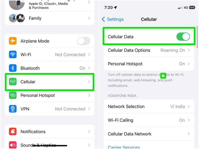 Efter nulstillingen skal du aktivere Cellular Data på din iPhone og kontrollere, om du kan få adgang til internettet på din enhed eller ej.