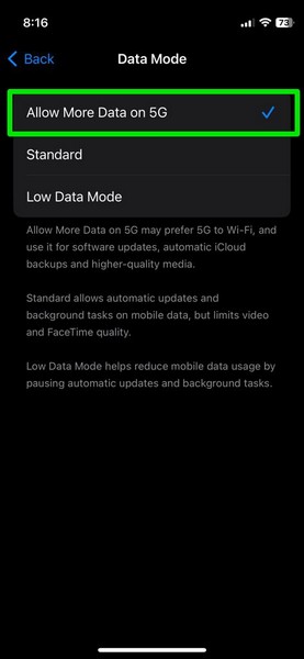 Du kan følge trinene lige nedenfor for at aktivere muligheden Tillad flere data på 5G for mobildata på din iPhone: