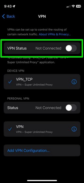 5.Sørg forskiften for VPN-status er deaktiveretpå din iPhone. Hvis den ikke er det, skal du trykke på knappen for at deaktivere VPN på din enhed.