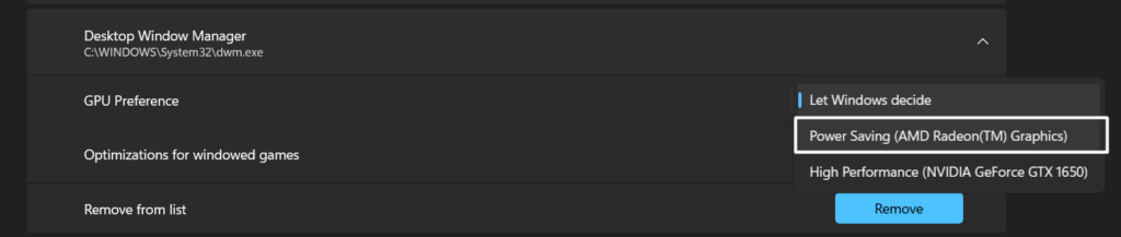 4.Klik påDesktop Window Managerfor at udvide sektionen og vælgeStrømbesparelsemulighed fraGPU præferencedropdown.