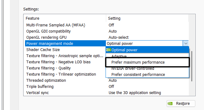 3.Søg efterStrømstyringstilstandiIndstillinger:boksen og vælgForetrækker maksimal ydeevnemulighed fra rullemenuen.
