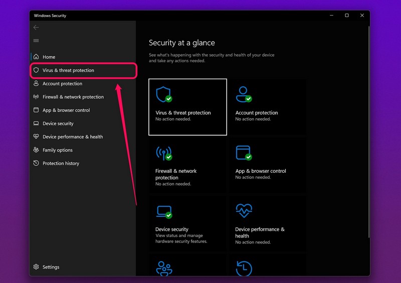 3.Vælg nuVirus- og trusselsbeskyttelsefanen på sidenavigationslinjen.