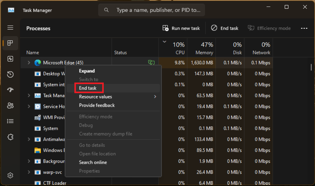 Hvis fejlen skyldes ressourcekonkurrence eller softwaresammenstød, kan stop af modstridende programmer hjælpe dig med at løse problemet. Når flere systemprogrammer kører samtidigt, konkurrerer de om systemressourcer som CPU, RAM og SSD/HDD.