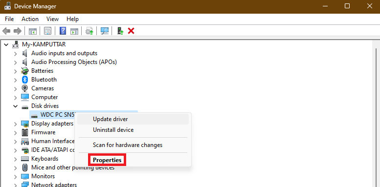 2.Højreklik på enhedsdriveren og vælgEgenskaber.