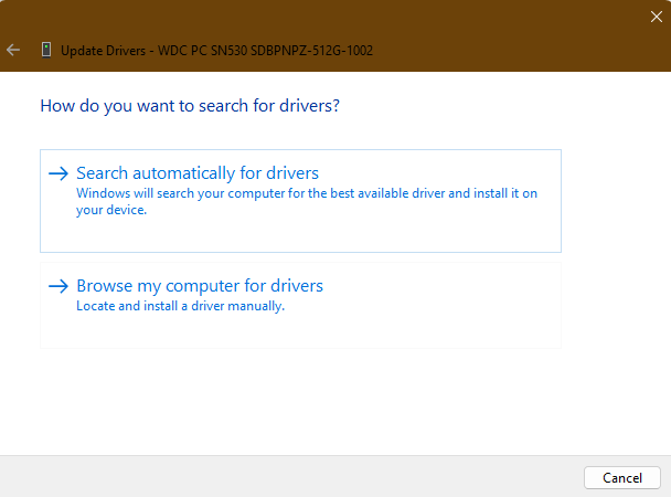 4.VælgSøg automatisk efter driveremulighed for at lade din computer installere den nyeste version automatisk. Hvis du har en opdateringsfil på din computer, skal du vælgeGennemse min computer for drivereog vælg filen.