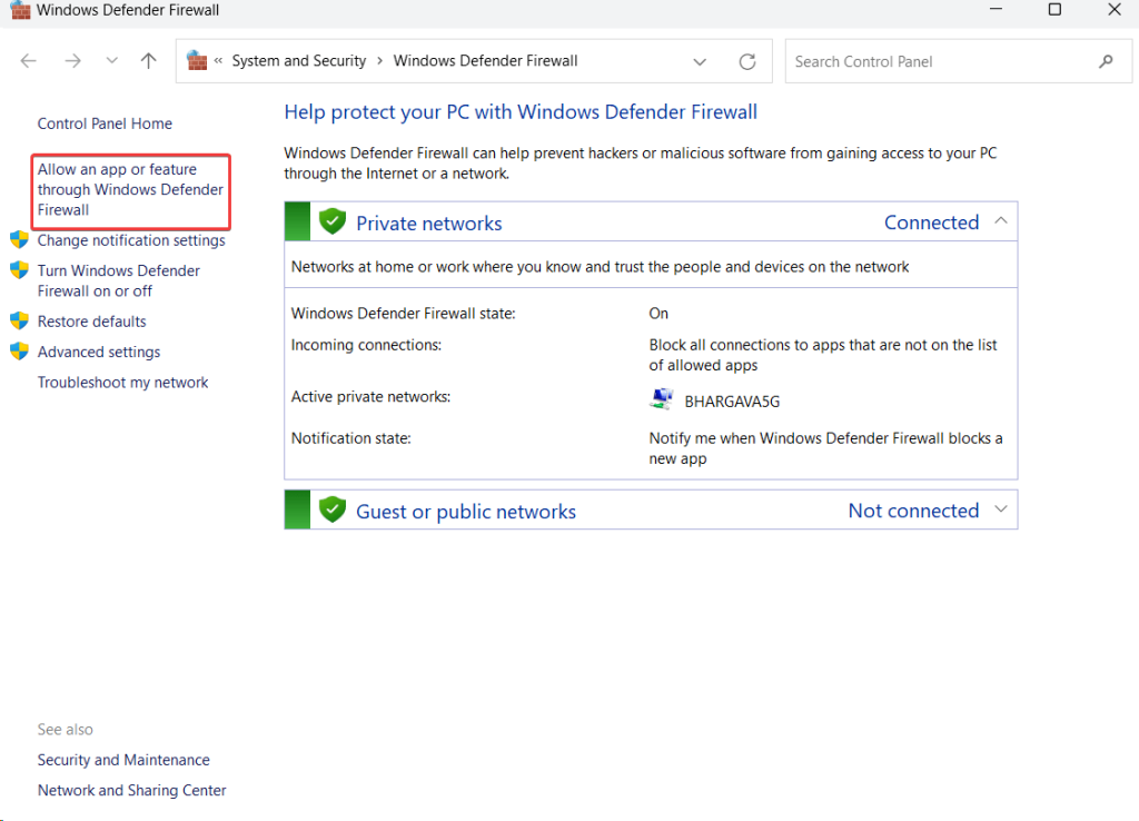 Trin 3 –Fra venstre, klik påTillad en app eller funktion via Windows Defender Firewall.
