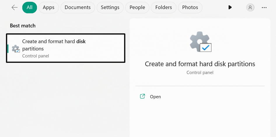 1.ÅbnWindows søgefelt, typeDiskhåndtering, og åbn appen på din pc.