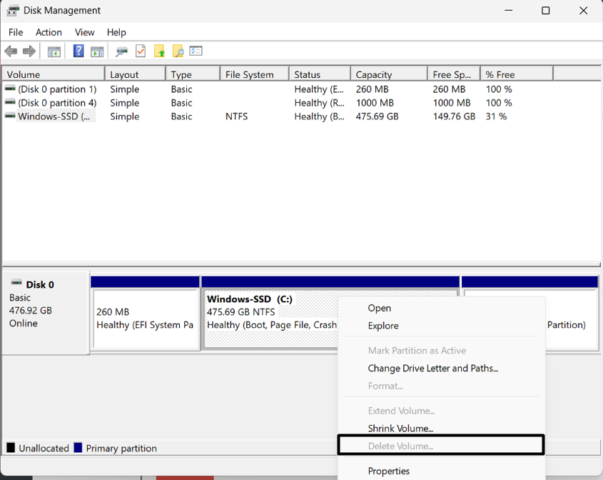 En anden måde at rette op på Udvid volumen-indstillingen i Windows 11 er atslet diskenheden i programmet Diskhåndtering. Hvis du gør det, slettes lagerdrevet fra din Windows 11-computer.
