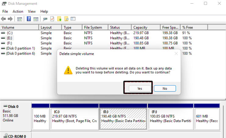 4.I denSlet simpel lydstyrkevindue, vælgJafor at slette alt på dette valgte lagerdrev.
