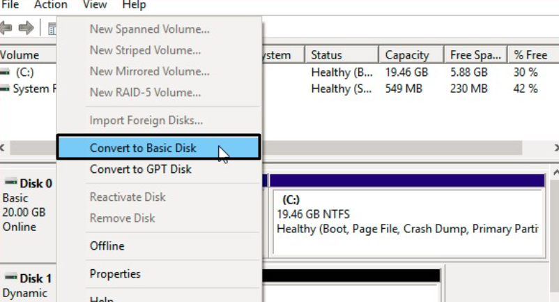 2.Vælg fra menuenKonverter til dynamisk disk, og vælg derefterKonverterevalgmulighed.