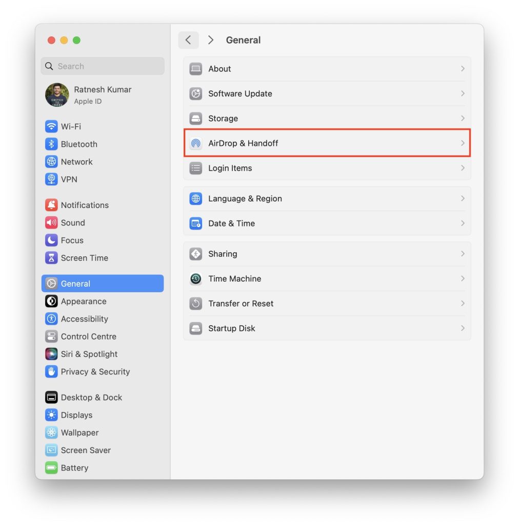 2.Klik påGenerelog derefterAirDrop & Handoff.
