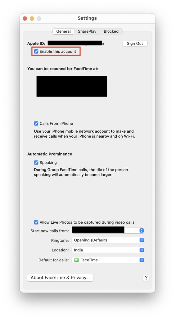 3.Gå tilFaceTime>Indstillingerog fjern derefter markeringen af indstillingen imodAktiver denne konto.