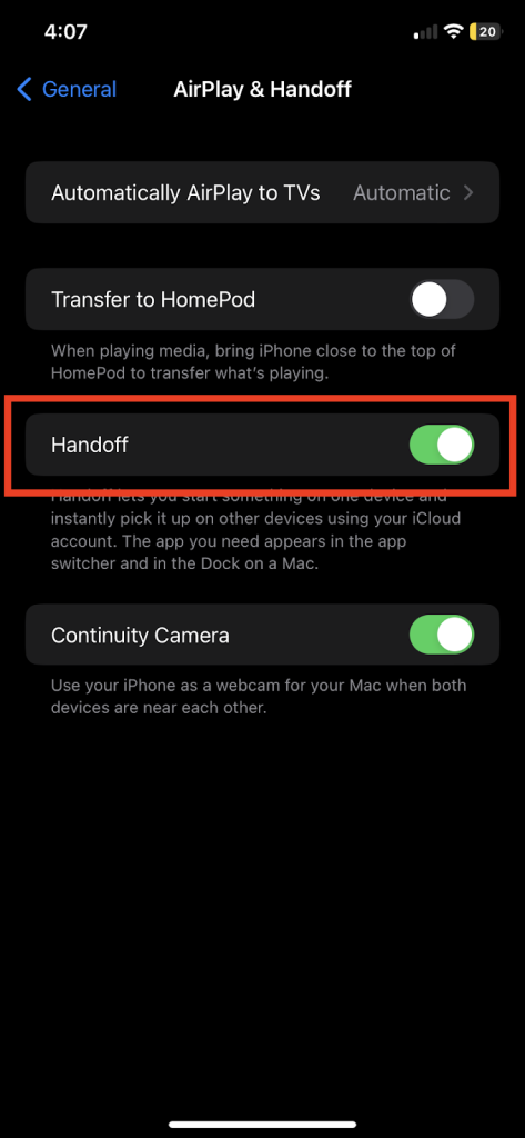 For at bruge handoff-funktionen skal du aktivere Handoff på iPhone ved at besøge appen Indstillinger og derefter trykke påGenerel>AirPlay & Handoff og slå derefter Handoff-funktionen til.