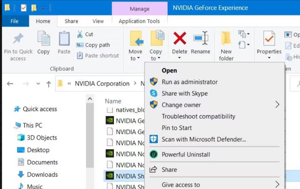 Trin 7:Naviger nu tilNVIDIAmappe igen, højreklik påNVIDIA Share.exe, og vælgKør som administrator.