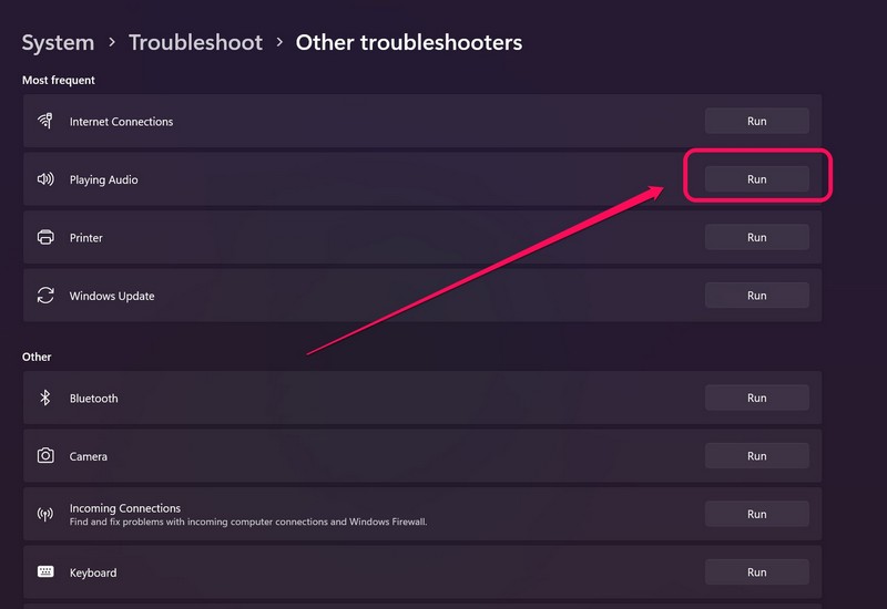 Du kan prøve at bruge den indbyggede Playing Audio-fejlfinding i Windows 11 til at scanne og løse lydproblemer på din bærbare computer eller pc. Du kan finde det i fejlfindingsindstillingerne i Windows 11.