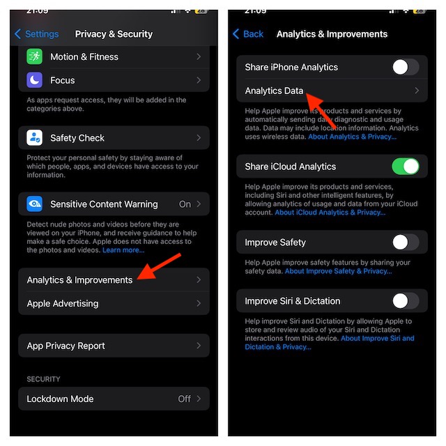 - Tryk derefter på Analytics og forbedringer -> Analysedata.