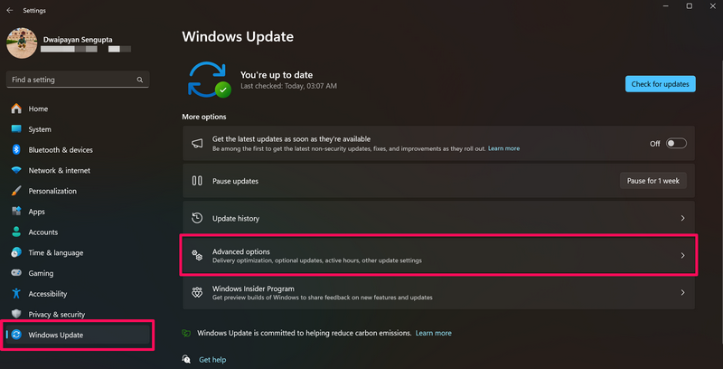 Hvis der ikke er tilgængelige driveropdateringer på din Windows 11-pc eller bærbare computer, kan du prøve at søge efter de seneste Windows 11-opdateringer. Du ser andet end forældede drivere, fejl og fejl i forældede Windows 11-versioner kan også forårsage, at Logitech G Hub ikke fungerer på din enhed.