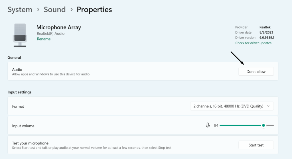 Du har muligvis ikke tilladt programmerne at bruge mikrofonen til lyd, hvorfor mikrofonen ikke fungerer korrekt. Så vi foreslår digaktiver "Tillad apps og Windows at bruge denne enhed til lyd" for din mikrofonpå din Windows 11 pc. For at vide, hvordan du aktiverer denne mulighed i Windows 11, skal du følge nedenstående trin på den: