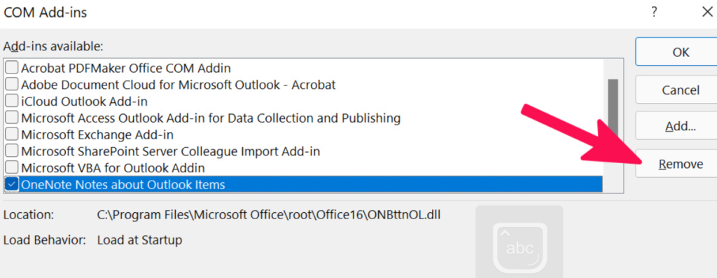 4.Klik påFjerneknappen i boksen for at fjerne alle de valgte tilføjelsesprogrammer fra Microsoft Outlook.