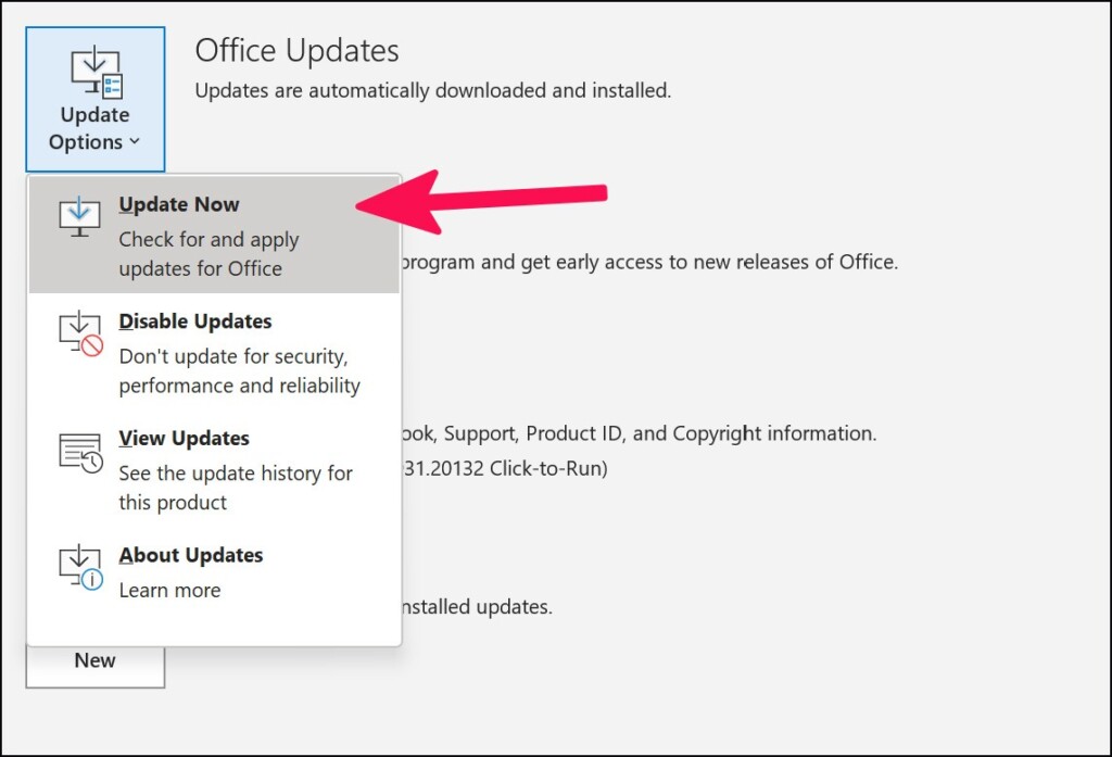 3.Til sidst skal du vælgeOpdater nufra rullemenuen for at installere afventende opdateringer til Microsoft Outlook-appen.