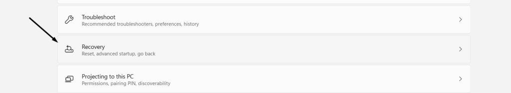 1.Naviger tilIndstillingerafsnittet på din Windows 11-pc og fortsæt tilGenopretningareal.