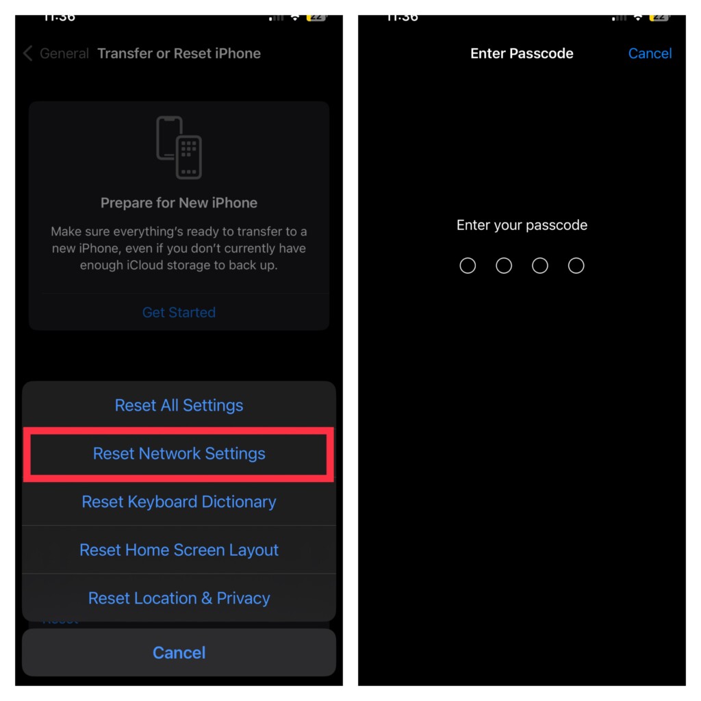 - På din iPhone skal du starte appen Indstillinger og navigere direkte til Generelt > Overfør eller Nulstil iPhone > Nulstil > Nulstil netværksindstillinger og bekræft processen.