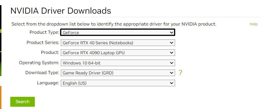 2.På den næste webside skal du vælgeGeForcemulighed fraProdukttype:rullemenu.