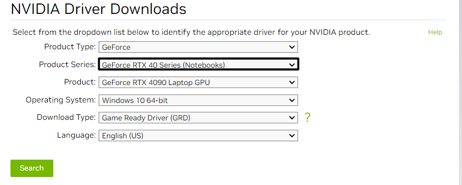 3.Når du er færdig, skal du vælge din Nvidia-grafikkortserie fraProduktserie:rullemenu.