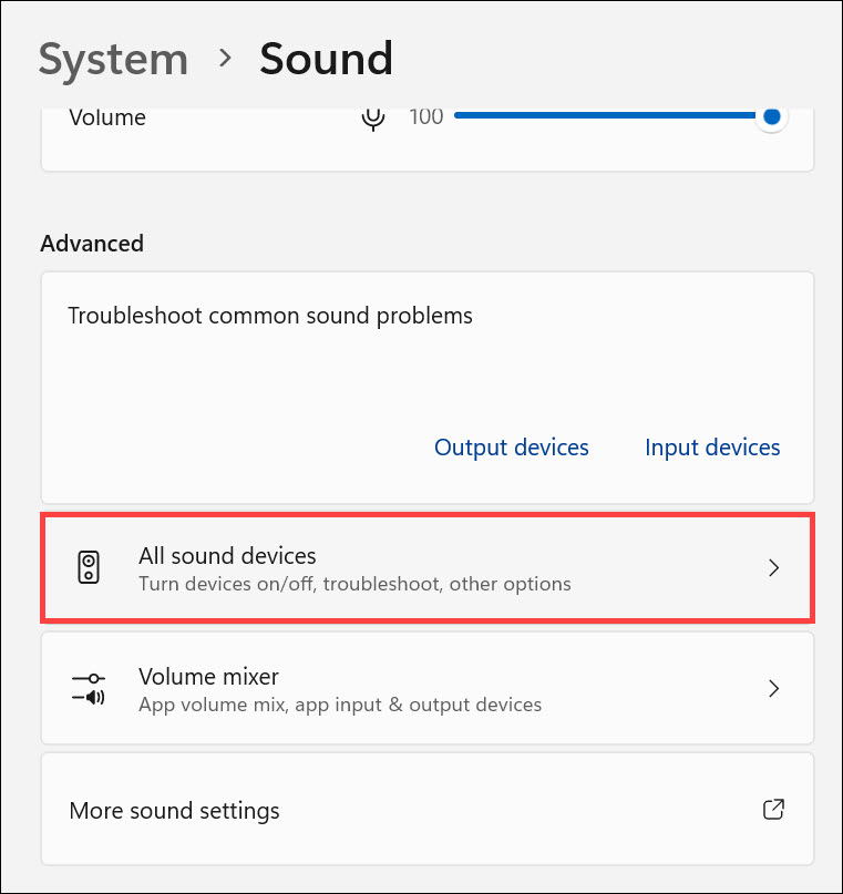 2.I denSundvindue, skal du vælgeAlle lydenhedermulighed underFremskredenafsnit.