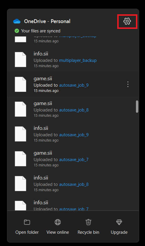 2.Gå til OneDrive-indstillinger ved hjælp af tandhjulsikonet øverst til højre.
