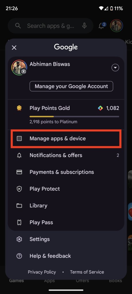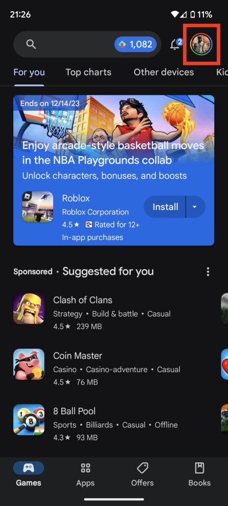 1.Gå tilPlay Butikog tryk på dit profilbillede i øverste højre hjørne.