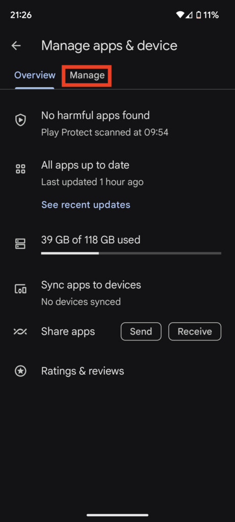 2.Klik påAdministrer app og enheder.