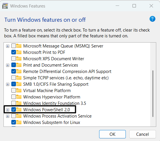3.Sørg for boksen ved siden afWindows PowerShell 2.0er tjekket.
