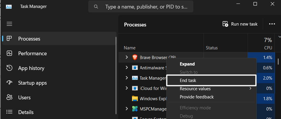 5.I sidste ende skal du tvinge alle kørende programmer og processer i Task Manager-appen.
