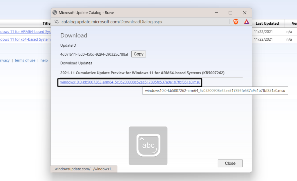 2.Når du er der, copy-pasteKB5007262ind i søgefeltet og trykIndtastfor at søge efter opdateringen.