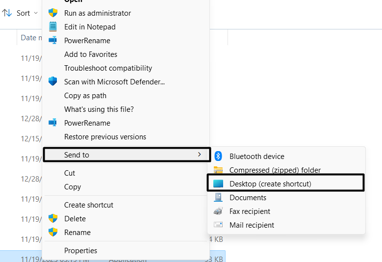 4.Hold pilen på i menuenSend tilog vælgDesktop (opret genvej)valgmulighed.