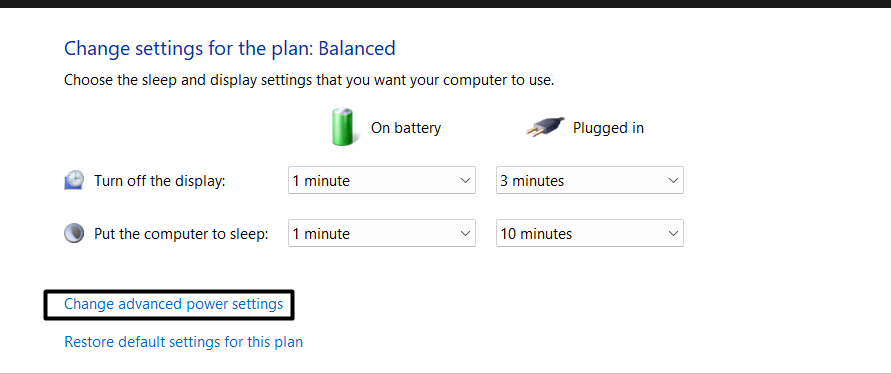 3.Klik derefter påSkift avancerede strømindstillingerpåSkift indstillinger for planen: Balanceretvindue.