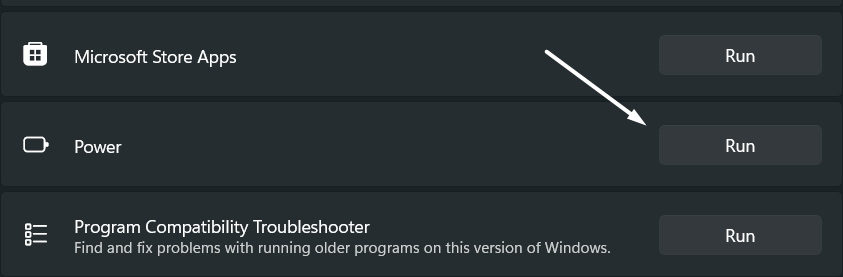 3.Klik derefter påLøbeknappen ved siden afMagtfor at starte strømfejlfindingsprocessen og løse problemer med systemet.