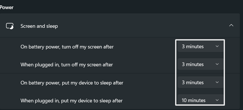 3.Til sidst iSkærm og dvalesektion, skal du sørge for, at hver indstilling har en timer tildelt. Hvis ikke, så tildel en timer til hver mulighed. Hvis du gør det, aktiveres dvaletilstand på din Windows 11-pc på få sekunder.