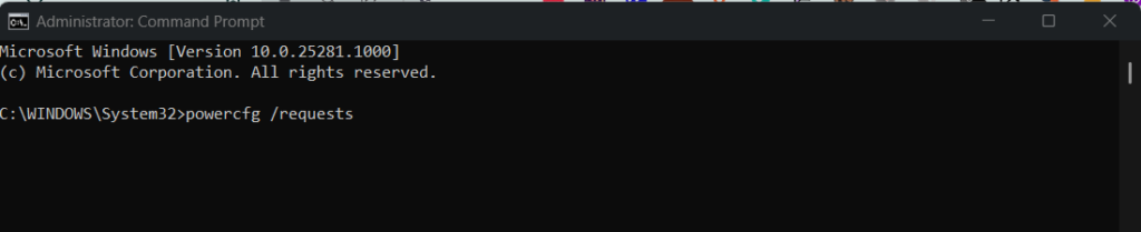 2.Når kommandoprompten er åbnet, skal du udførepowercfg /requestskommando i konsollen for at se alle de kørende programmer og processer, der påvirker dit systems batteriforbrug.