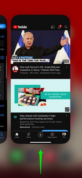 1.Med YouTube-appen åben,stryg op fra bundenaf din iPhone-skærm oghold midtvejsat åbneApp Switcher.