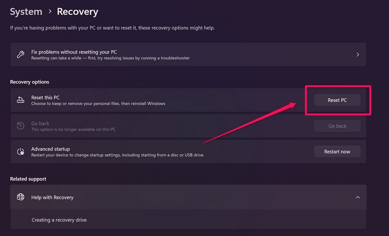 3.Klik nu påNulstil pcknappen ved siden af indstillingen Nulstil denne pc under afsnittet Gendannelsesindstillinger.