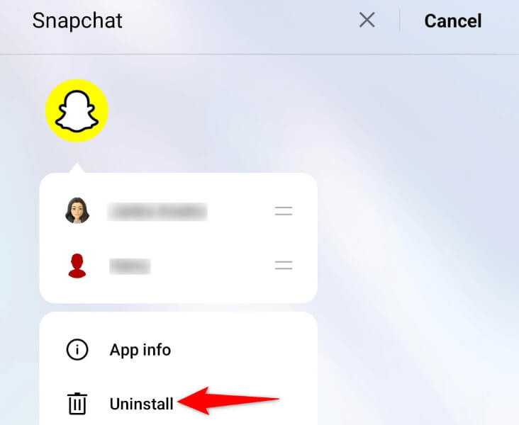 - Tryk og holdSnapchati din appskuffe, og vælgAfinstaller.