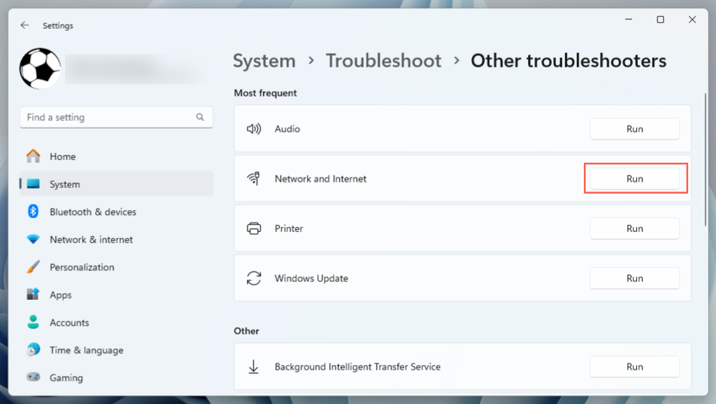 - Vælg knappen Kør ud for Netværk og internet. I Windows 10 skal du vælgeInternetforbindelserog vælgKør fejlfindingen.