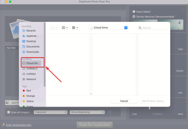 Trin 4 – Når du har valgtiCloud Drive, vælg billederne. Og klik videreScan for dubletterfra bunden af grænsefladen.