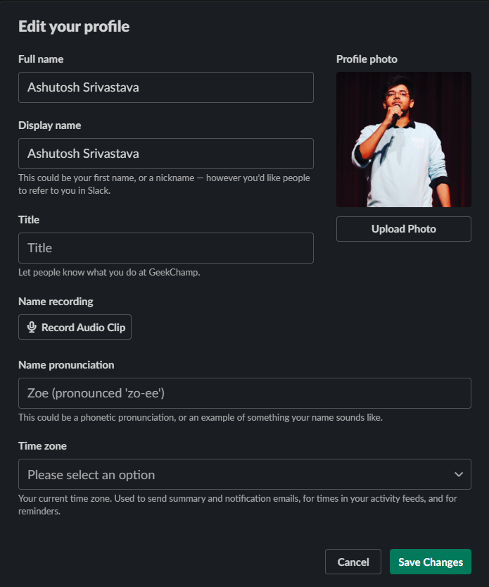 - Brug dit fulde navn, da det er den mest grundlæggende måde at identificere dig selv på Slack. Desuden er det afgørende at bruge dit rigtige navn, ikke et kaldenavn eller alias, så dine kolleger ikke vil have problemer med at finde dig. Hvis du har et navn, som de fleste har svært ved at udtale, og du skal forholde dig til at rette det på møder, skal du ikke bekymre dig mere. Mens du redigerer din profil på Slack, kan du finde en sektion, hvor du kan skrive, hvordan dit navn udtales. Desuden kan du også optage et lydklip til at udtale dit navn og tilføje det til din Slack-profil.
