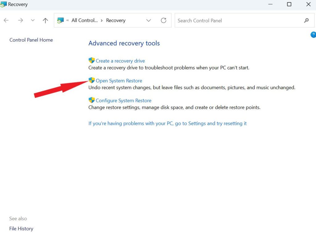 Trin 2:Tryk på'Åben systemgendannelse.'