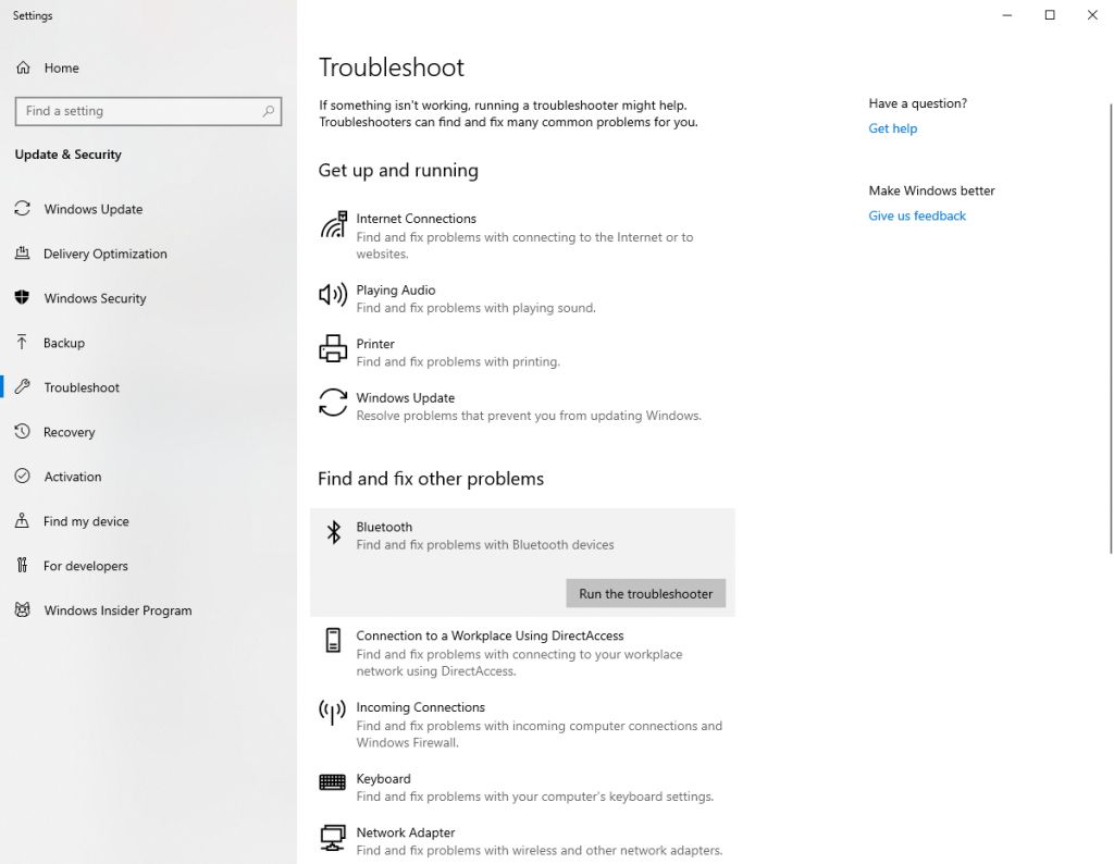 Trin 3 –Fra højre, underFejlfinding, klik påKør fejlfindingenved siden afBluetooth.