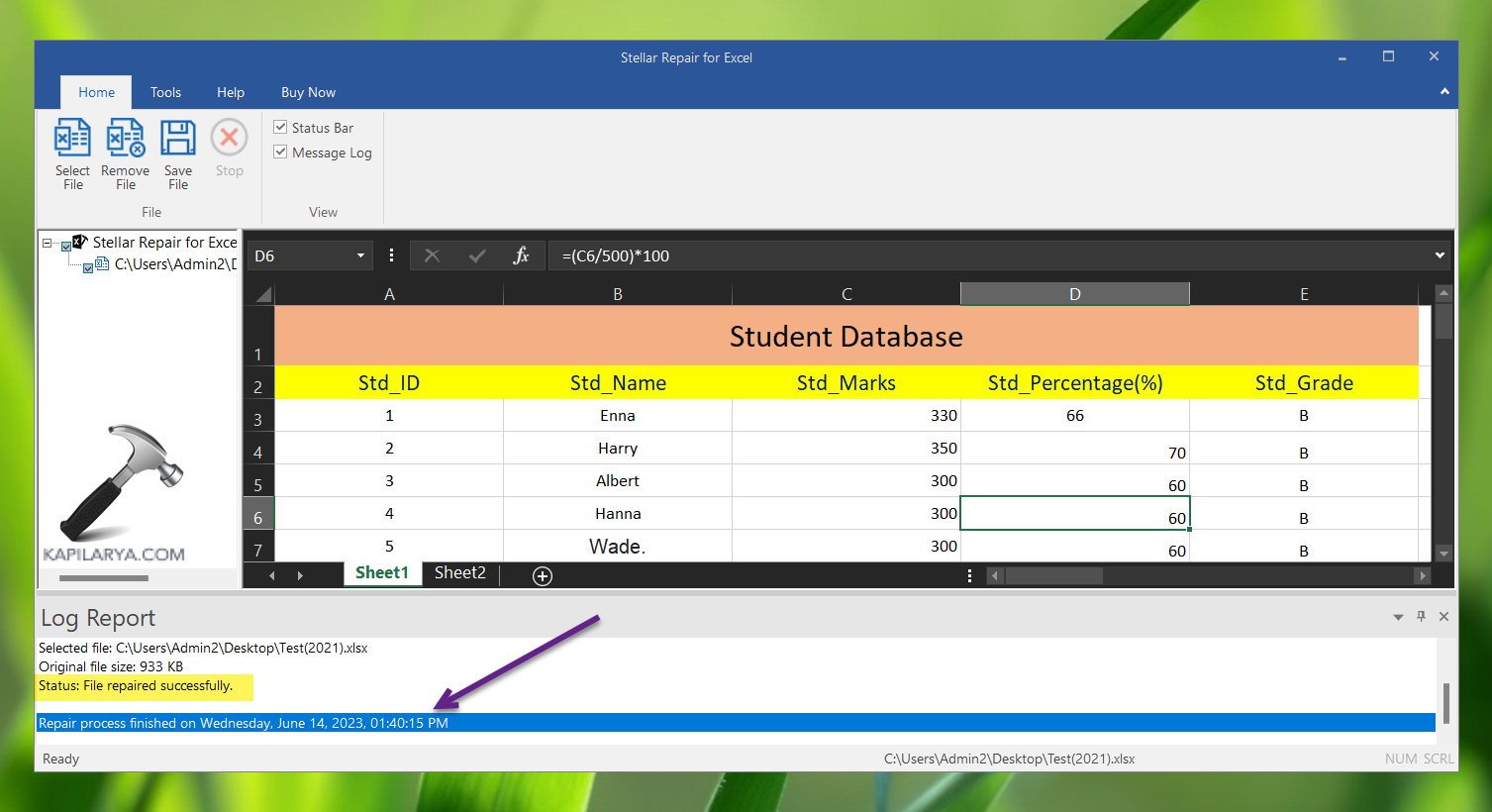 - Softwaren viser en forhåndsvisning af den reparerede Excel-fil og dens genskabelige indhold i hovedgrænsefladen.