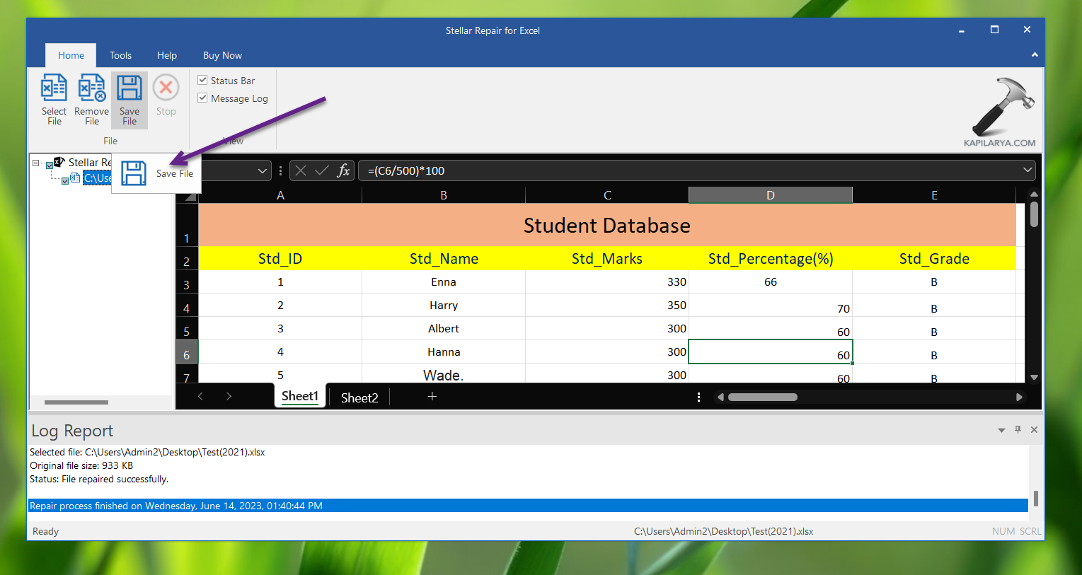 - Klik på Gem fil for at gemme den reparerede Excel-fil. Denne funktion er tilgængelig, når du har købt værktøjet, og du bruger den betalte version.